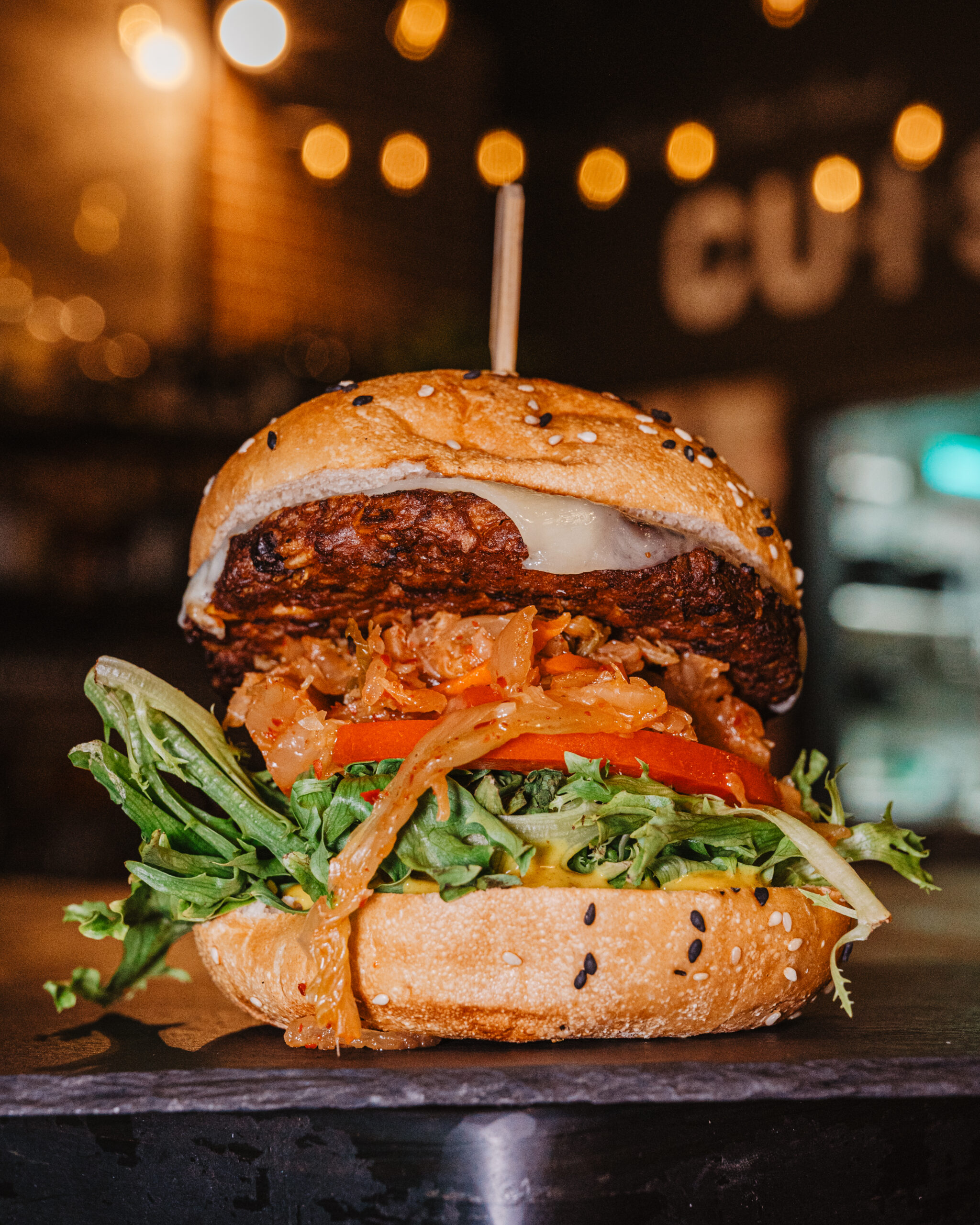 Galette d’haricots noirs épicée cuite sur le grill servie avec kimchi, fromage, sauce érable et curry, laitue et tomate, sur pain sésame *possibilité de pain sans gluten (+ 2 $)